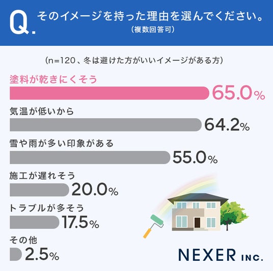 冬の外壁塗装を避けたい理由としては、「塗料が乾きにくそう」「気温が低いから」といった、施工品質への不安が多く挙げられました。