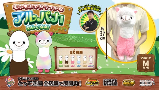 今回登場するのはもふもふの触り心地とカラフルなデザインが特徴の「アルパカぬいぐるみ」が登場します。クレーンゲームのプロ・五十嵐直也氏監修のもと、思わず抱きしめたくなる柔らかさと、愛らしい表情にこだわって制作されました。 サイズは約37cmと、インテリアとしても存在感があり、お子さまから大人まで幅広い世代にお楽しみいただけるボリューム感です。カラーはグリーン、ブラウン、ピンク、ブルー、ベージュ、レインボーの全6種類を展開します。それぞれ異なる色合いをまとったアルパカは、コレクション性も高く、複数集めたくなるラインナップとなっています。