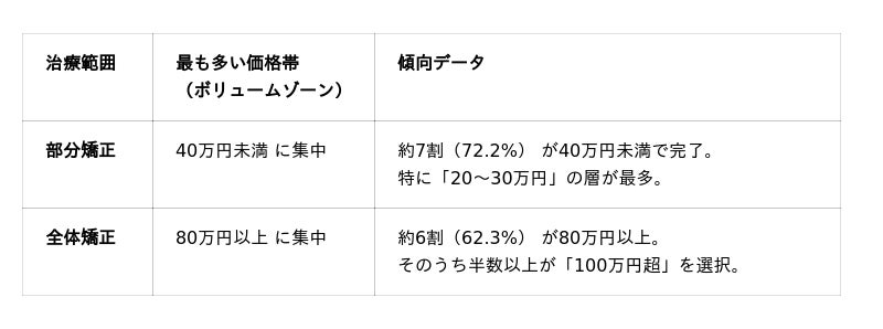 この「費用の2極化」の背景には、「治療範囲」の違いがあります。データを分析すると、部分矯正を選んだ層の約7割は40万円未満に収まっているのに対し、全体矯正を選んだ層の約6割は80万円以上かかっています。
