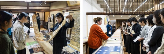 2023年度から続く過去5回の開催では延べ約60名が参加し、岡文織物(西陣織)、南條工房(鳴物神仏具)、匠弘堂(宮大工)、山元染工場(型友禅)、千本銘木商会(銘木屋)の工房を訪れ、工芸品が出来上がる工程や職人たちによる熟練の技を間近で見学しました。