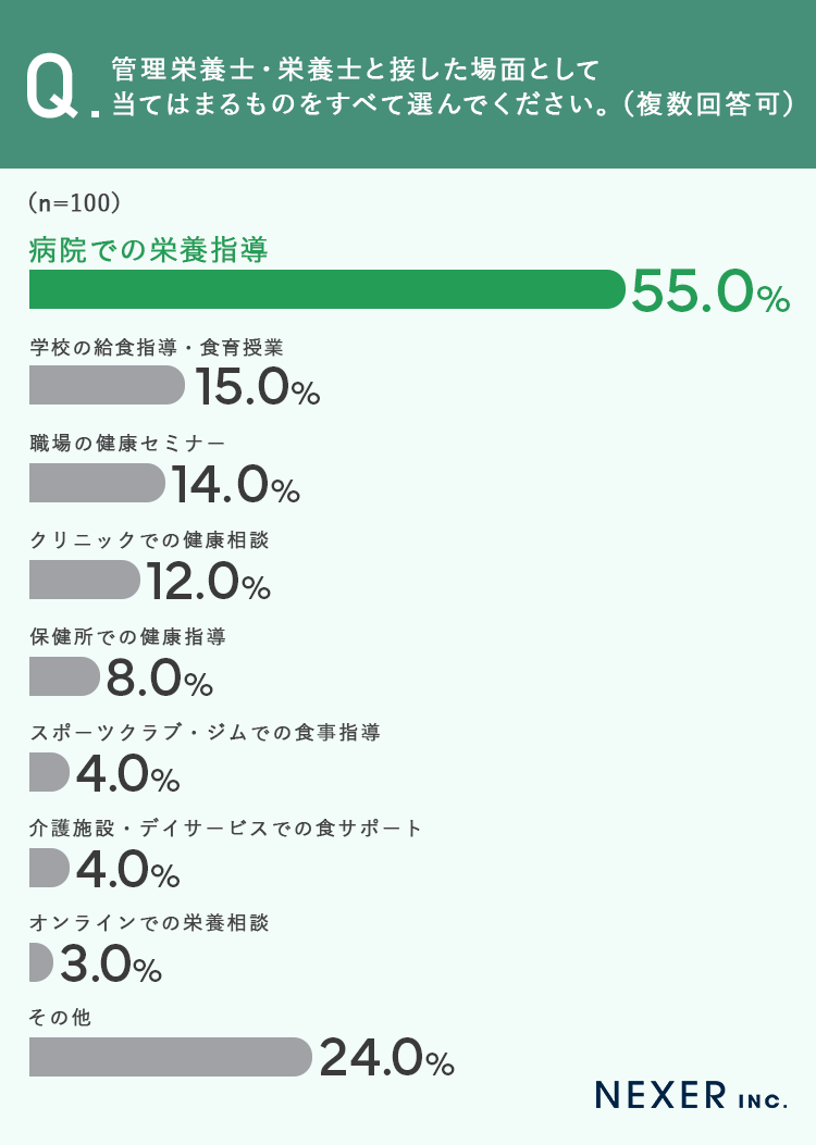 病院での栄養指導が半数以上を占めたことから、多くの人が病気や健康上の課題をきっかけに管理栄養士・栄養士と出会っていることがわかります。