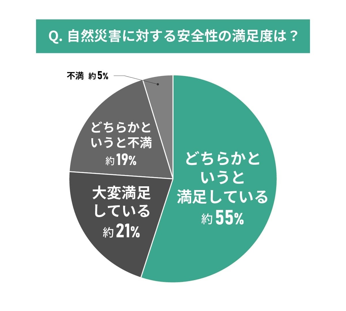 一方で、物価については58%の住民が不満を感じており、家賃・生活費の高さは渋谷区居住の最大の課題です。治安についても34%が不満を示しており、特に繁華街周辺の夜間の安全性には注意が必要です。また、自然災害への安全性は76%が満足しているものの、谷地形による水害リスクへの懸念も見られました。