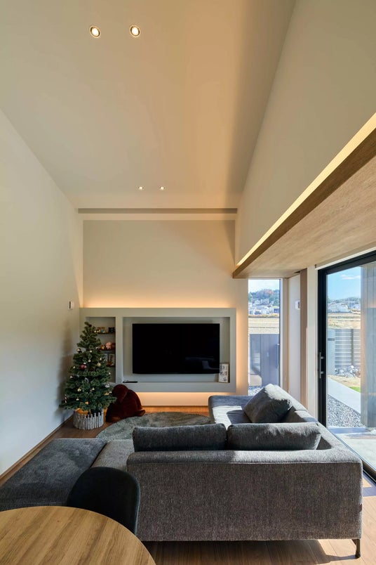 リビングダイニングは勾配天井にすることで緩やかにゾーニング。テレビ背面や下がり天井部には間接照明を仕込むことで華やかさを演出しました。