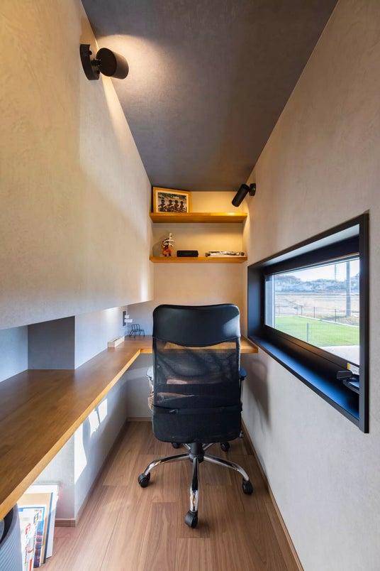 約1畳とコンパクトでありながら、階段下を有効活用して必要な収納量を確保した書斎スペース。座った際の目線の高さに合わせて窓を設けることで、開放感を演出しています。