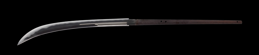 本薙刀は室町時代の守護大名・山名宗全の末裔にあたる山名豊国が所持し、明治維新に至るまで山名家に伝えられてきました。安土桃山時代に活動していた刀工で、新刀期初期屈指の名工・堀川国広が鍛えた1振りです。力強く、荒々しい波を思わせる刃文をお楽しみいただけます。