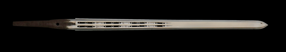 新年の幕開けにあわせ、企画展「いろんな刀大集合」では当館所蔵品の中から魅力ある作品を展示いたします。なかでも、平安時代頃の作と考えられる「古剣 無銘」は注目すべき1振りです。本剣のような両刃造は、片刃に深い反りのある太刀、いわゆる日本刀が誕生する以前の刀剣の姿になります。こうした形態に加え、本剣は刃の中心に特徴的な彫物が施されていることから、本剣は実戦用ではなく、貴族の装身具、あるいは祭神具であった可能性が考えられているのです。