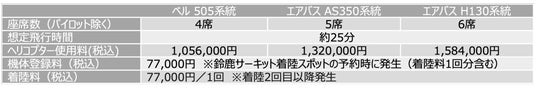 ※雨天による欠航の場合、ヘリコプター使用料及び着陸料は返金可。ただし、予約時に発生する機体登録料(77,000円)のみ返金不可とさせていただきます。