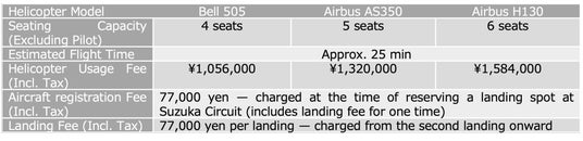 ・ 例年グランプリ開催の1ヶ月前に鈴鹿サーキットの着陸スポットの予約受付が開始され、離着陸時間が確定いたします。当社への予約段階では希望時間のリクエストを受け付けますが、確約するものではございません。