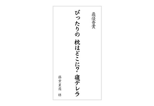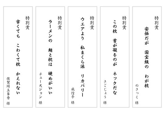 五・七・五の定型にしっかりと乗りつつ、言葉遊びの楽しさと、枕選びの真理をついた内容でしたので優秀賞にノミネートさせていただきました。