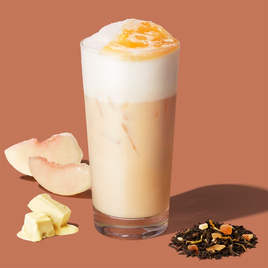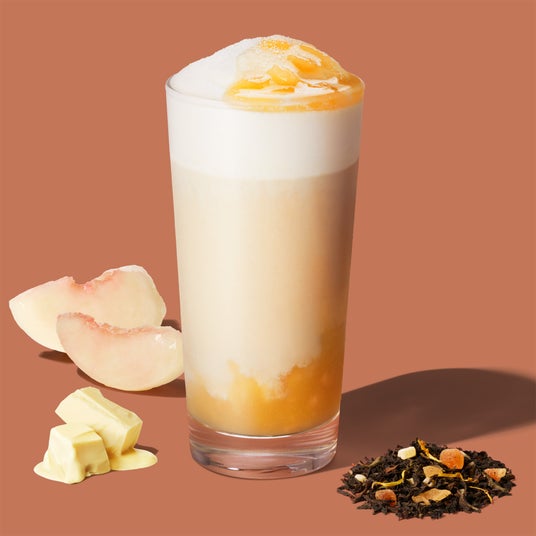 『ホワイト ピーチ & ジョイフルメドレー ムース ティー ラテ』は、「ジョイフルメドレー」にミルク、ホワイトピーチのフレーバーシロップを合わせたフルーティーさとティーの華やかな風味のティー ラテです。ふんわりとした口どけのティームースをトップにのせて、とろっとした甘さのホワイトピーチ果肉ソースとホワイトチョコレートパウダーで仕上げました。ホワイトピーチのやさしい甘さと表情豊かな「ジョイフルメドレー」※の味わいが口の中で溶け合い最後のひと口まで楽しめるティー ラテです。ホットとアイスの2種類からお選びいただけます。