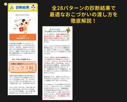 本ツールは、当協会が培ってきた金融教育の知見に基づき、GOEN株式会社がシステムを構築・提供。簡単な設問に回答することで、お子さまの性格や発達段階に合わせた「最適な渡し方(定額制・報酬制など)」や、家庭での金融教育におけるアドバイスを全28パターンの結果から提示します。
