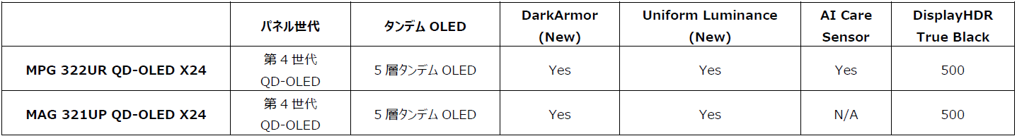 MSI(Micro-Star INT'L CO., LTD.)は32インチ4K QD-OLEDゲーミングモニターのラインアップにおいて、大幅なアップデートを発表しました。新たに投入される MPG 322UR QD-OLED X24 と MAG 321UP QD-OLED X24 は、それぞれ異なるゲーマープロファイルに合わせて設計されています。両モデルには最新の 5層タンデムOLED構造 と EL Gen 3テクノロジー を採用し、32インチ4Kクラスにおける輝度効率と耐久性の新基準を打ち立てます。