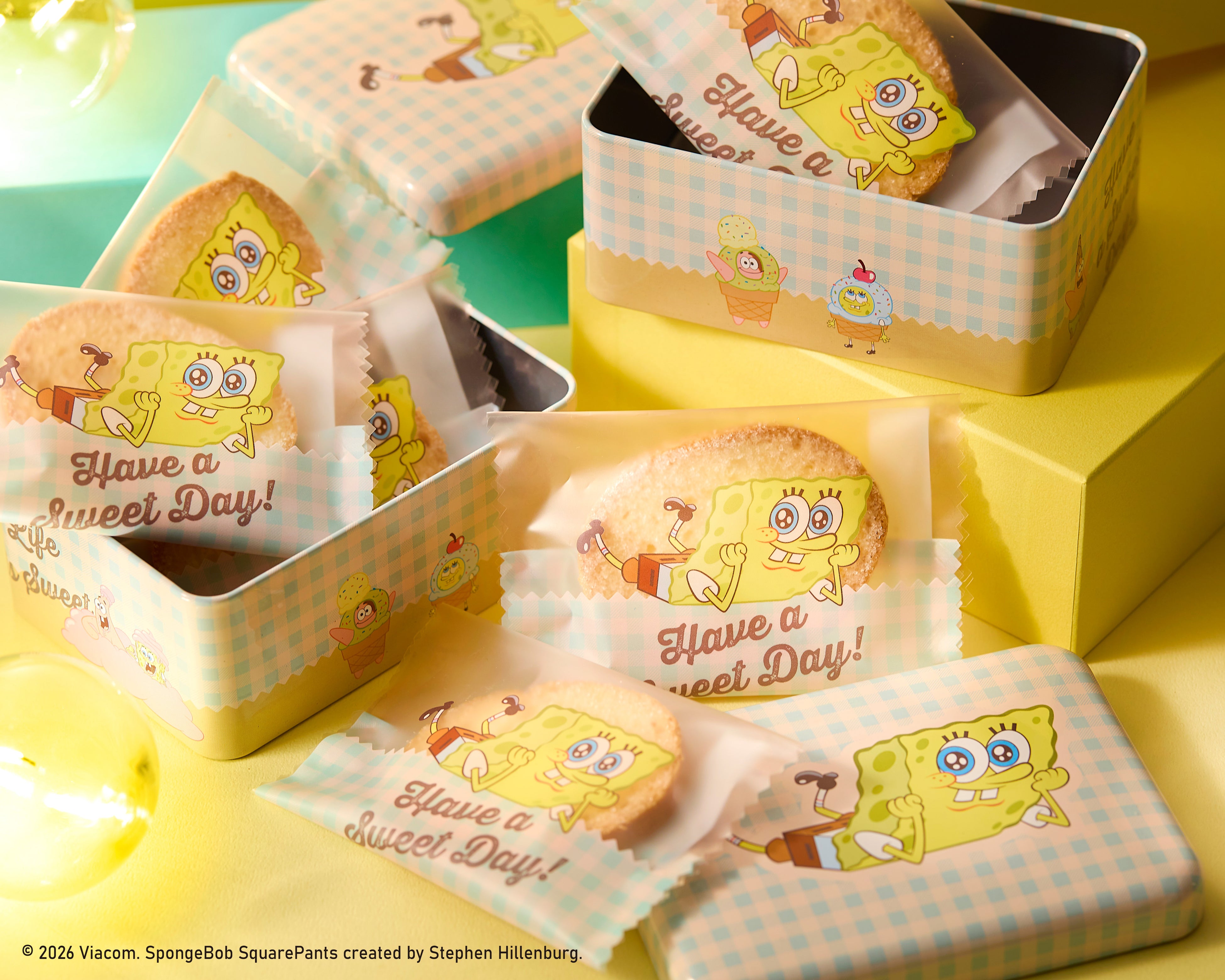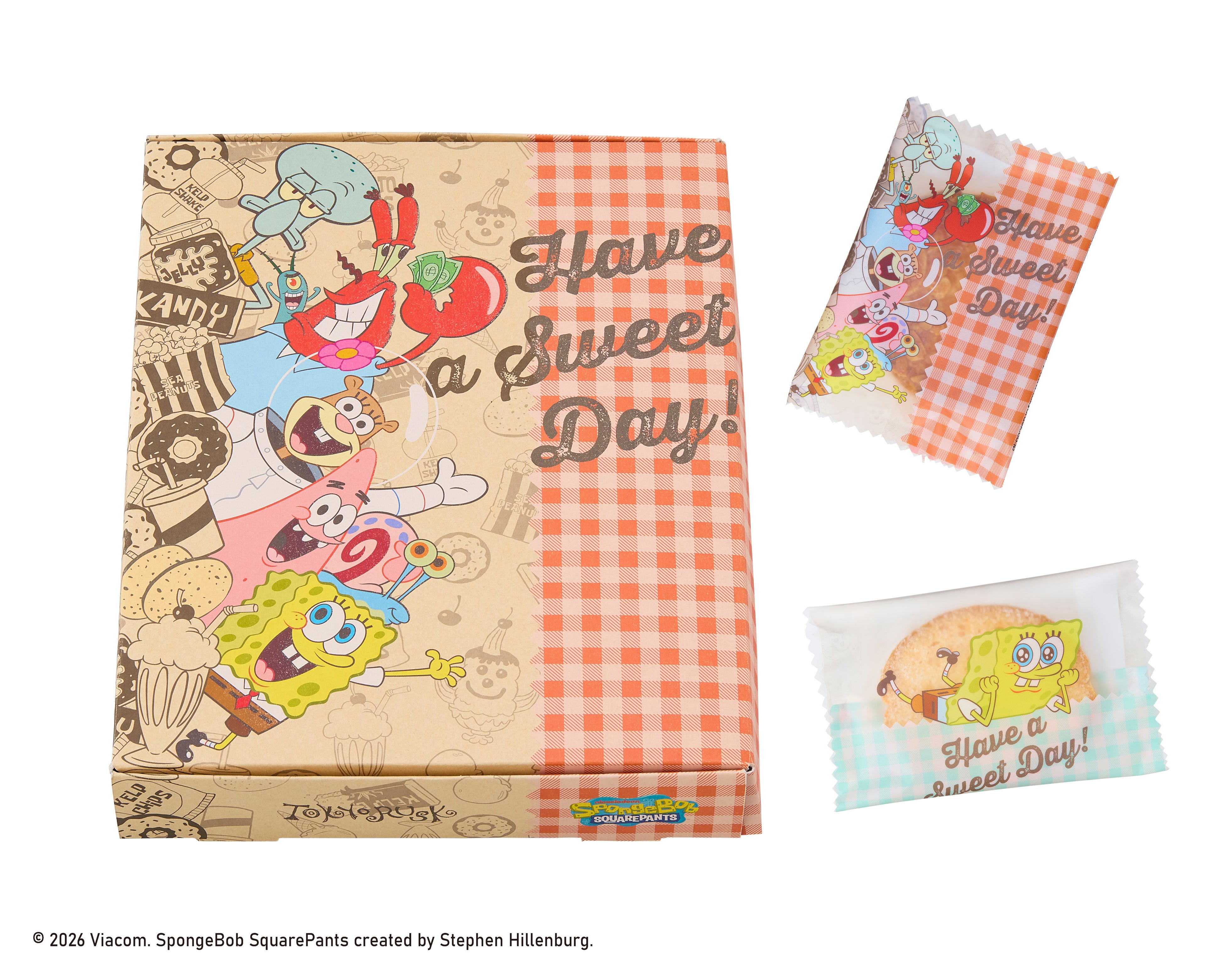 カリフォルニア産アーモンドに芳醇なキャラメルが絡み合う濃厚なお味を楽しめる『キャラメルアマンド』と、小麦とお砂糖の甘さ、バターの香り、素材の美味しさを味わえる『シュガーバター』の詰め合わせ。スポンジ・ボブと仲間たちが集まったかわいいボックス入りです。