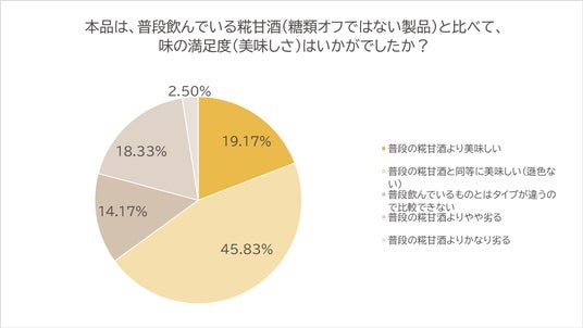 普段から甘酒を飲用しているユーザーに、本品と普段飲んでいる甘酒を比較してもらったところ、「普段の糀甘酒よりおいしい(18.9%)」「普段の糀甘酒と同等においしい(45.1%)」と回答した人が合わせて64.0%に達しました 。 甘酒本来のコクや風味を損なうことなく、糖質を抑えた点が、甘酒ユーザーからも高く評価されています。