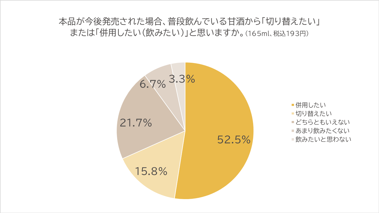 3. 【購入意向】「切り替えたい」22.1%に対し「併用したい」51.6%で、合計73.7%が購入意向あり。普段の甘酒と“使い分け”ニーズが見えた。