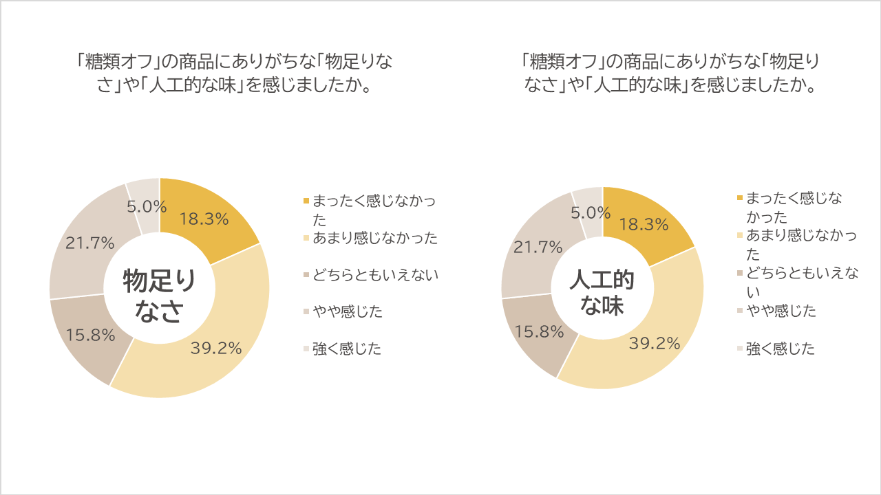 一般的に糖質オフ商品に対して抱かれがちな「味の物足りなさ」や「人工的な甘み」についても調査を行いました。 その結果、「物足りなさ」を「全く~あまり感じなかった」人は56.6% 、「人工的な味」を「全く~あまり感じなかった」人は64.8% といずれも過半数を超え、自然な味わいが実現されていることが裏付けられました。