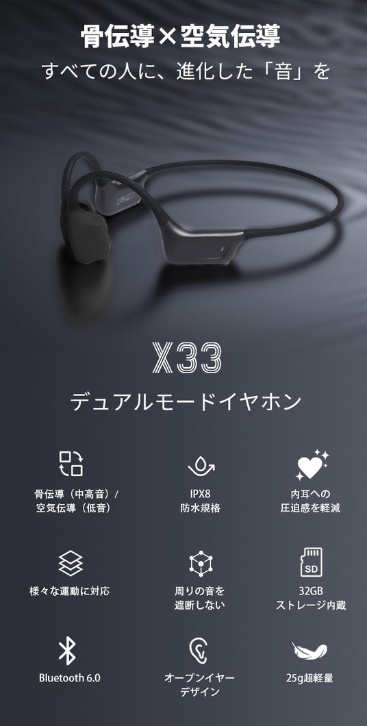 IPX8防水の骨伝導×空気伝導 デュアルドライバーイヤホン「X33」。
