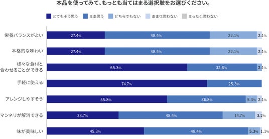 使ってみた評価としては、「手軽に使える」が74.7%、「様々な食材と合わせることができる」が63.5%と高い評価でした。