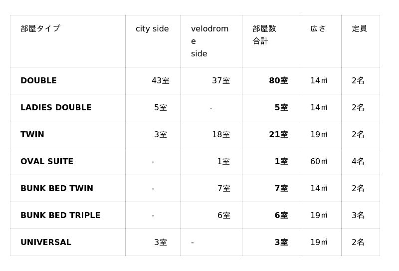 「CARAVAN」をコンセプトに、次の冒険へ心が躍る滞在を演出。7タイプあるお部屋すべての客室内に自転車の持ち込みができ、必要なものへすぐ手が届くコンパクトで機能的なレイアウトに、遊び心ある要素を加え、サイクリストから旅行者まで、多様な旅のスタイルに寄り添う客室となっている。全123室のうち69室が競輪バンク側(velodrome side/ヴェロドロームサイド)に面しており、部屋から競輪場を眺めることができます。