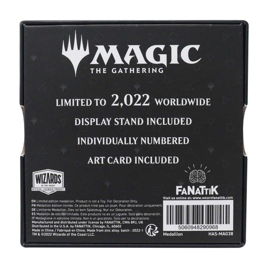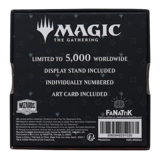 高さ16cmのXLサイズで重量感のあるエンボス加工が施され、裏面には個別シリアルナンバーと、カードアーティスト・ヴォルカン・バガの公式サインおよびマジック:ザ・ギャザリングのロゴが入っています。世界限定5,000個の希少アイテムで、付属のディスプレイスタンドでそのまま飾ることができます。