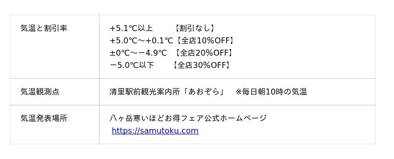 本フェアは、開催期間中のその日の朝10時の気温に応じて、参加店舗における食事やショッピングなどの対象商品・サービスが割引となる、八ヶ岳ならではのユニークな冬季イベントです。