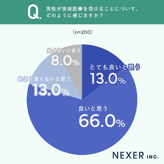 「とても良いと思う」が13%、「良いと思う」が66%と、合わせて約8割の女性が男性の美容医療に肯定的な意見を示しました。