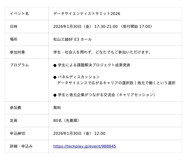 本プログラムの集大成として、松山市主催による成果発表会「データサイエンティストサミット2026」が、1月30日(金)に開催されます。当日は、学生による分析成果の発表のほか、地域でのキャリア形成をテーマとしたパネルディスカッションや、学生と企業の交流会が行われます。