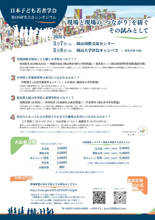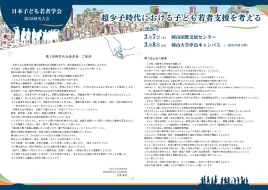日本子ども若者学会(本部:岡山県岡山市)は、2026年3月7日(土)・8日(日)の2日間にわたり、「日本子ども若者学会 第1回研究大会」を岡山県内にて開催します。本大会は、2025年11月に設立された日本子ども若者学会にとって初の研究大会となります。