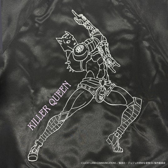 アニメ『ジョジョの奇妙な冒険 ダイヤモンドは砕けない』より「吉良吉影」のスタンド「キラークイーン」をモチーフにしたスカジャン。光沢のあるサテン生地にフロント、バックともに刺繍を施しました。裏地の総柄プリントもポイントです。