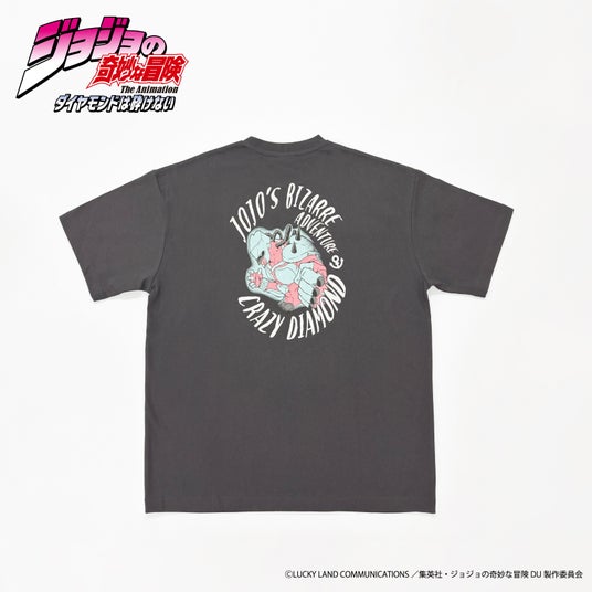 アニメ『ジョジョの奇妙な冒険 ダイヤモンドは砕けない』より「東方仗助」のスタンド「クレイジー・ダイヤモンド」をモチーフにしたTシャツ。フロントはさりげなくワンポイントのデザインを施し、バックには「クレイジー・ダイヤモンド」を大胆にプリントしたデザインです。