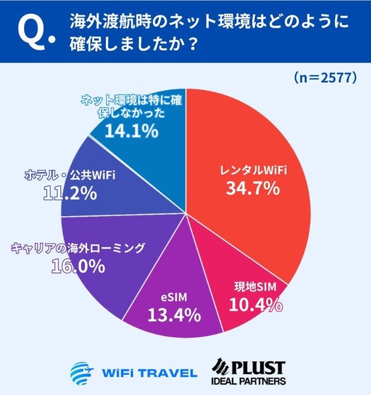 海外渡航時のインターネット環境について尋ねたところ、「レンタルWiFi」を利用した人が34.7%と最も多い結果となりました。