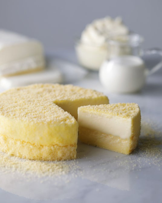 【看板商品】ドゥーブルフロマージュベイクドチーズとレアチーズの2層仕立てのチーズケーキ。上層には、ミルク感が引き立つレアチーズ、下層にはしっかりとしたコクを感じるベイクドチーズが組み合わされ、口の中で一体となり、くちにした瞬間ふわっと広がる濃厚なミルク感と、とろけるようななめらかなくちどけの味わいが絶妙なバランスを生み出しています。