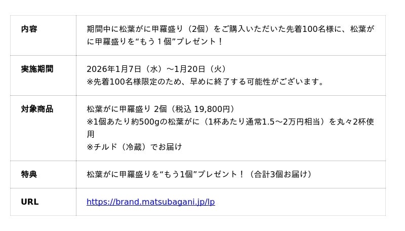 2026年1月7日(水)~1月20日(火)の期間中に、当社通販サイトで松葉がに甲羅盛り(2個)をご購入いただいた先着100名様に、“松葉がに甲羅盛りをもう1個”プレゼントいたします。熟練の職人が一つ一つ丁寧に手作業で盛り付けた、今しか食べることのできない“松葉がに甲羅盛り”をこの機会にぜひお召し上がりください。