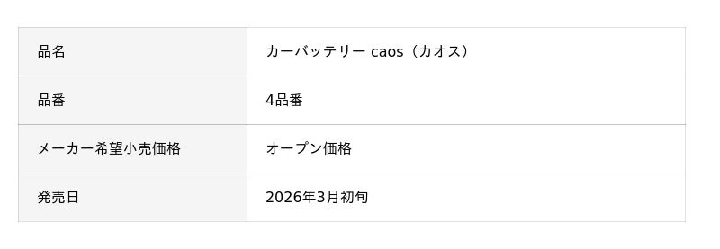 パナソニック オートモーティブシステムズ株式会社(以下、パナソニック)は、カーバッテリー「caos(カオス)」が発売20周年を迎えたことに加え、2026年3月初旬に新製品4品番を発売します。