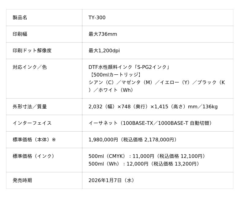 TY-300は、当社が昨年2024年9月に市場に投入し、多くのお客様や市場関係者から高い評価を得ているDTF転写プリンターのNewスタンダードモデルです。