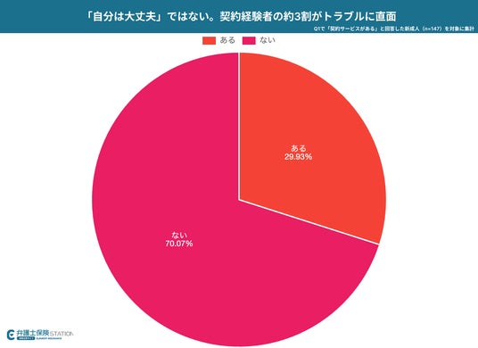 自身の名前で契約を行った経験がある新成人のうち、約3割にあたる29.9%が「契約に関して困ったことやトラブルの経験がある」と回答しました。多くの新成人が適正にサービスを利用している一方で、契約経験者の約3人に1人が何らかの問題に直面しており、決して無視できない頻度でトラブルが発生しています。
