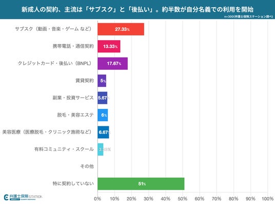 新成人の49%が過去1年以内に自身の名前で何らかの契約を行いました。内容は「動画・音楽等のサブスクリプション」が約27.3%で最多、次いで「クレジットカード・後払い」が約17.7%と続きます。