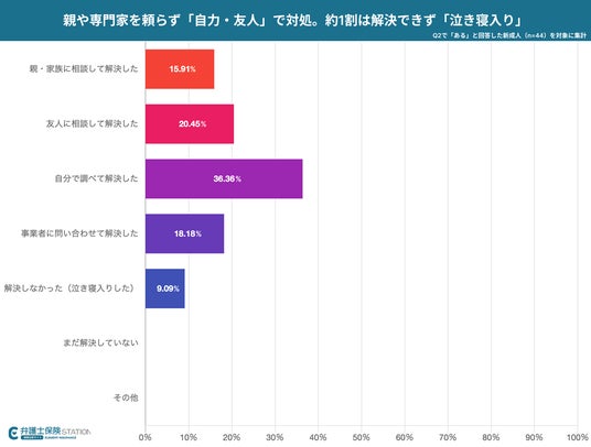 解決策は「自分で調べて解決」が約36.4%で最多となり、「友人への相談」(約20.5%)、「事業者への問い合わせ」(約18.2%)が続きました。「親・家族への相談」は約15.9%にとどまる一方、約9.1%が「解決せず泣き寝入りした」と回答。