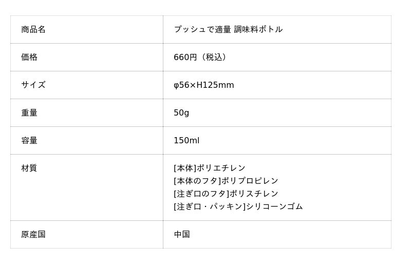 日常の使いづらさを軽減するため、プッシュ式で吐出量をコントロールしやすい調味料ボトル。