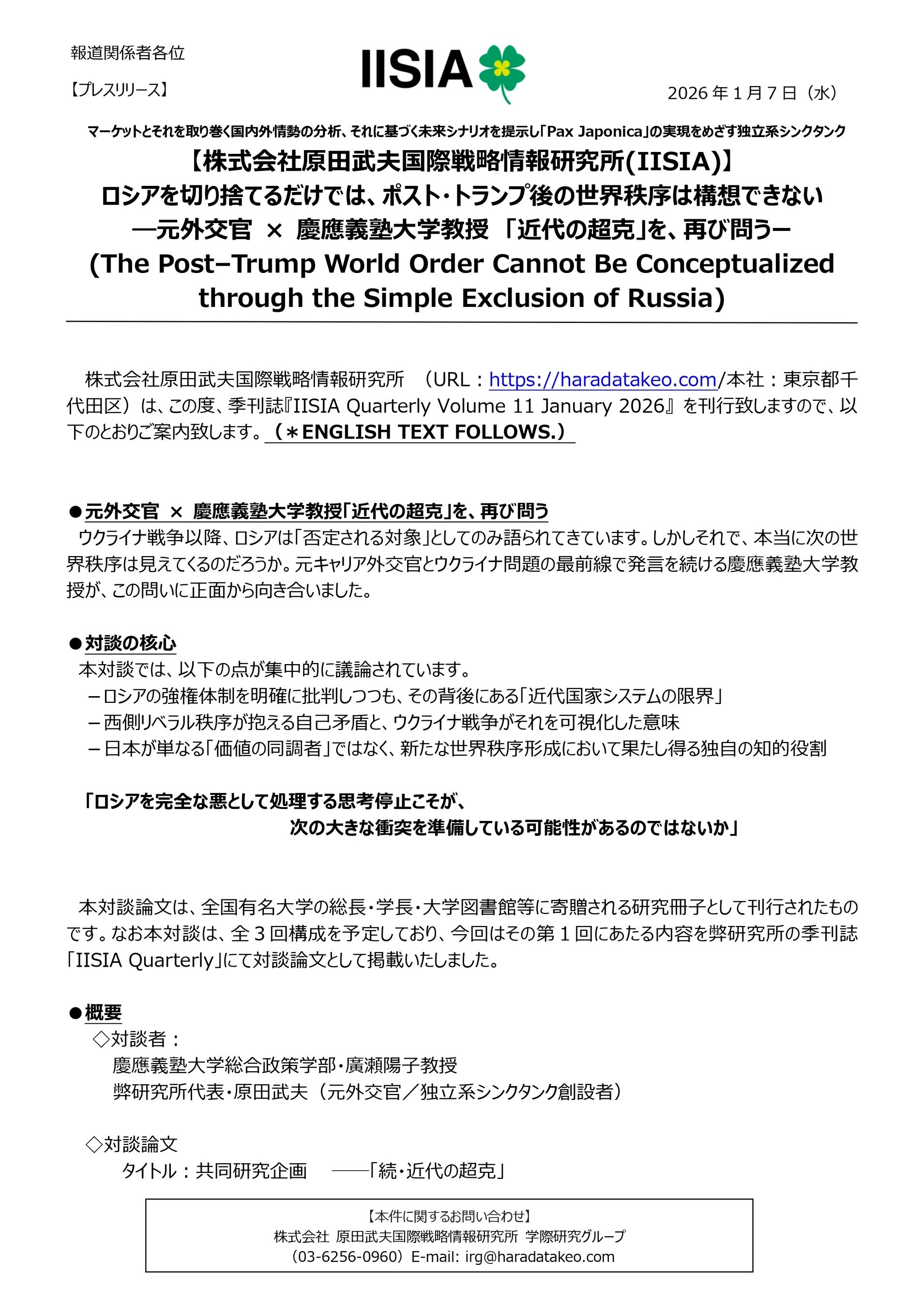 株式会社原田武夫国際戦略情報研究所 (URL:https://haradatakeo.com/本社:東京都千代田区)はこの度、季刊誌『IISIA Quarterly Volume 11 January 2026』 を刊行致しますので、以下のとおりご案内致します。
