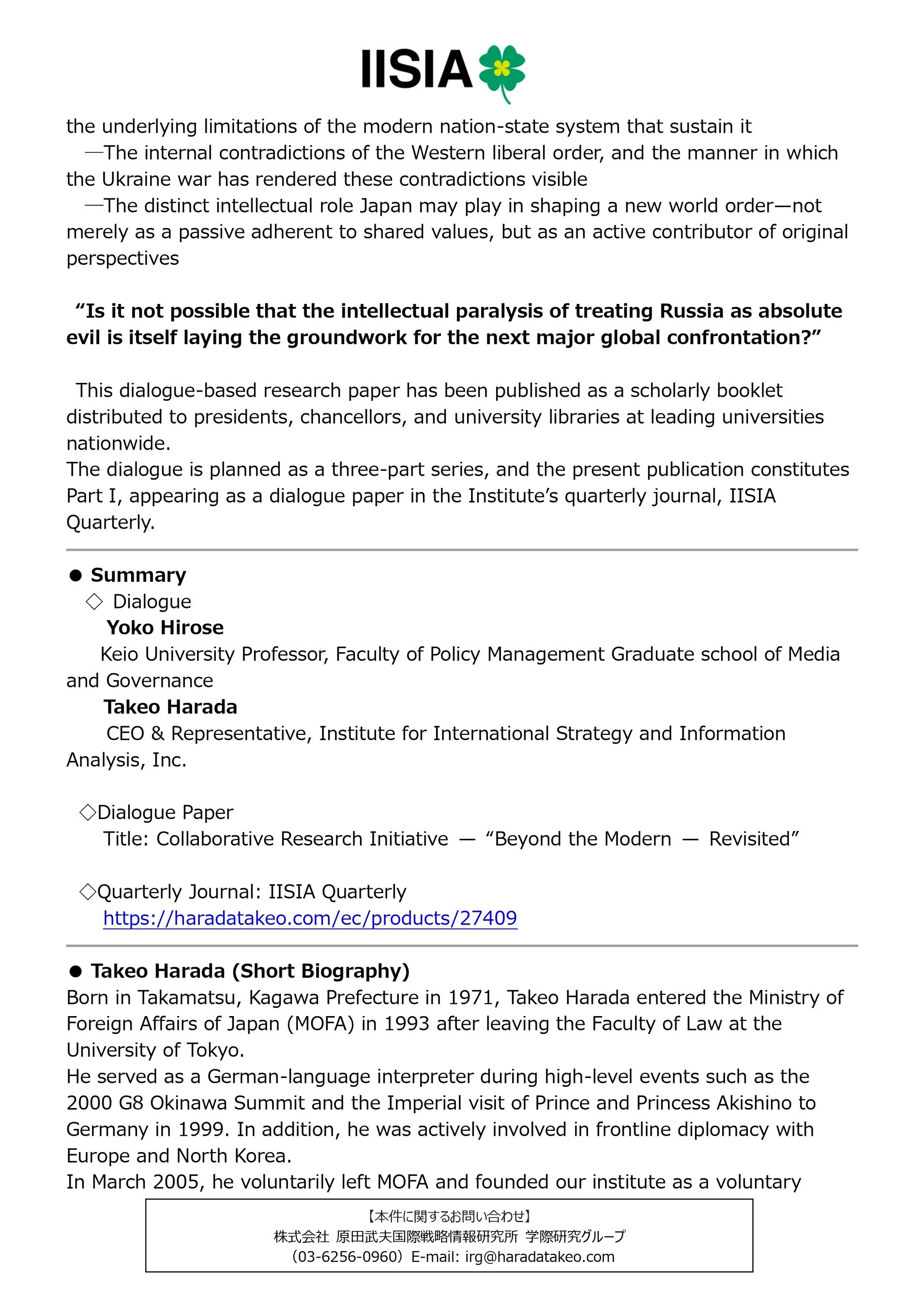 本対談論文は、全国有名大学の総長・学長・大学図書館等に寄贈される研究冊子として刊行されたものです。なお本対談は、全3回構成を予定しており、今回はその第1回にあたる内容を弊研究所の季刊誌「IISIA Quarterly」にて対談論文として掲載いたしました。