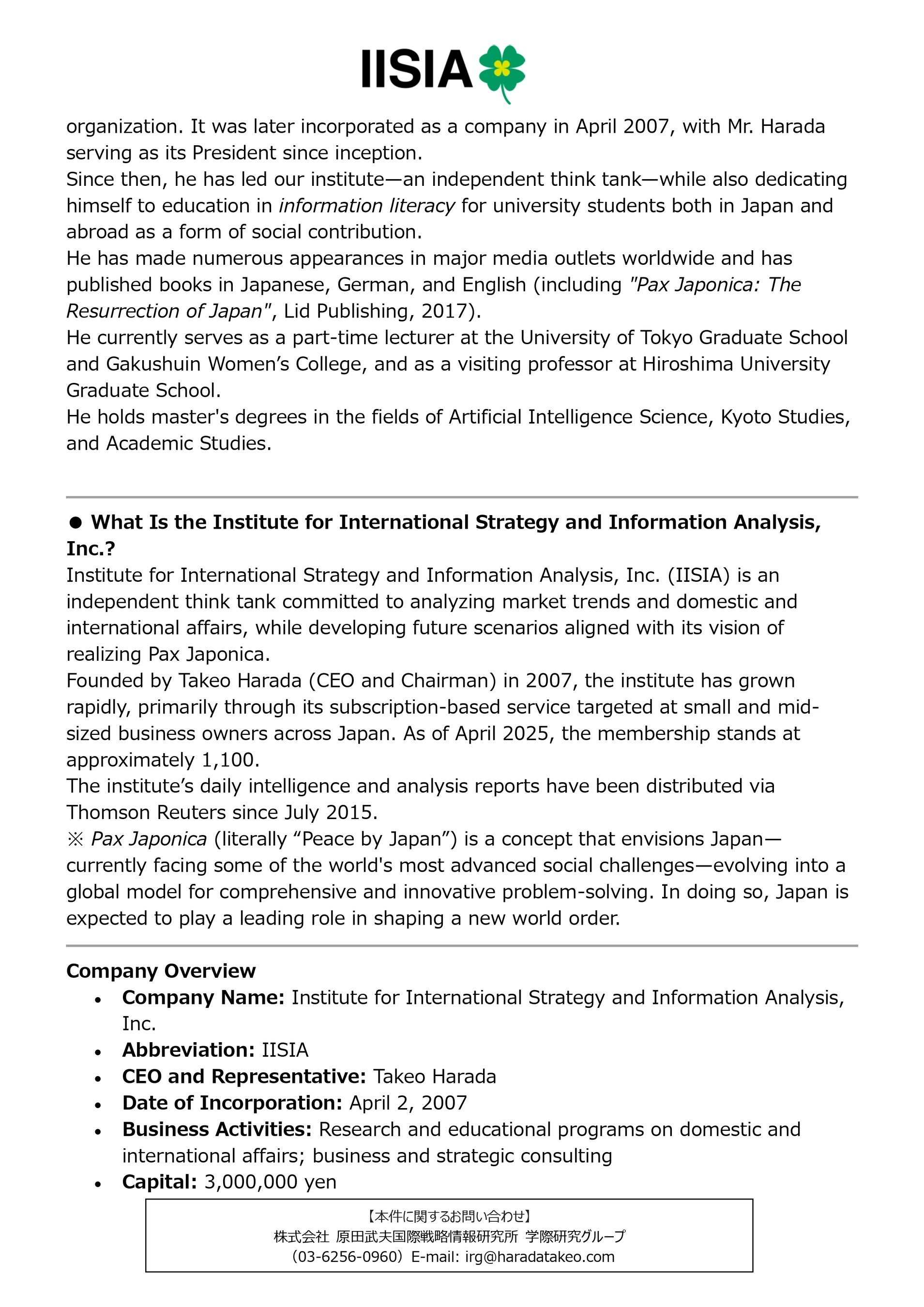 英語表記:Institute for International Strategy and Information Analysis, Inc.(略称:IISIA)