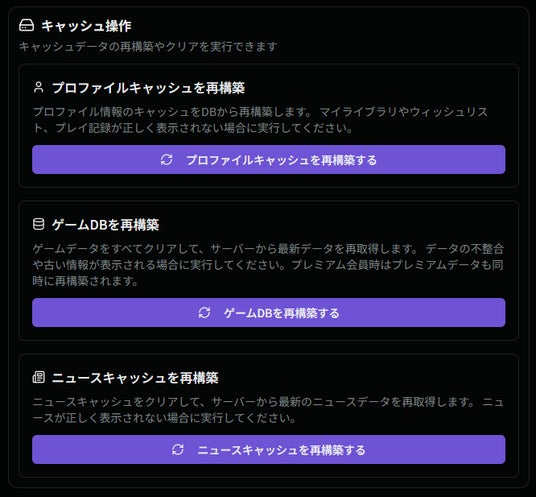 検索結果のレイアウトやリンクが最新のデータに基づき正しく表示されるよう、ユーザー自身で最新のデータへ更新できる「ゲームDBの再構築」機能を提供しています。