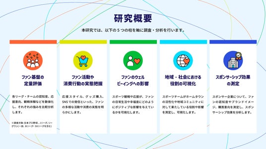 本研究は、業界最大規模のリサーチ基盤を保有する株式会社インテージ(本社:東京都千代田区)と協業し、同社の信頼性の高いデータ収集・調査ノウハウと、ファン総合研究所が持つファン心理の分析ノウハウを掛け合わせることで、スポーツの影響力と価値を定量的に可視化するものです。