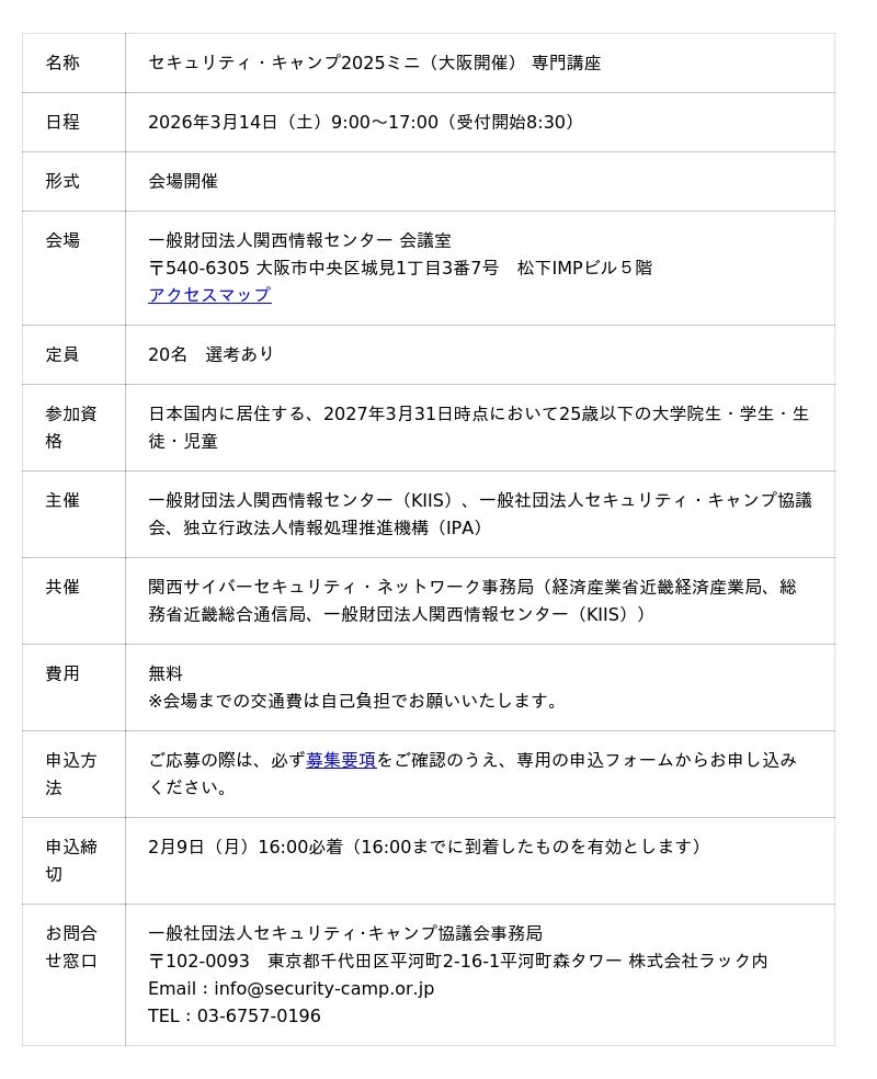 イベント詳細:https://www.security-camp.or.jp/minicamp/osaka2026.html