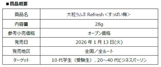 森永製菓株式会社(東京都港区芝浦、代表取締役社長COO・森 信也)は、ひと粒が通常のラムネの約 1.5 倍のサイズで食べ応えのある「大粒ラムネ」シリーズから、強烈な酸味とシャリシャリ食感で気持ちを切り替えられる「大粒ラムネRefresh<すっぱい梅>」を1月13日(火)より新発売いたします。