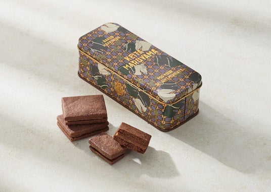 <KEITA MARUYAMA(ケイタマルヤマ)>のアーカイブテキスタイルを使用した、華やかなデザインのパッケージ。なかにはチョコレートのプラリネを挟んだカカオ風味のサブレを詰めました。