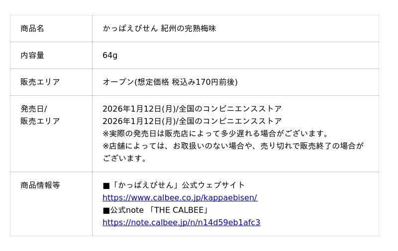 カルビー株式会社(本社:東京都千代田区、代表取締役社長兼CEO:江原 信)は、“やめられない、とまらない♪”でおなじみの「かっぱえびせん」より、紀州産の完熟梅を使用した『かっぱえびせん 紀州の完熟梅味』を2026年1月12日(月)から全国のコンビニエンスストア先行で期間限定発売します。コンビニエンスストア以外の店舗では、同年1月19日(月)から期間限定発売します(2026年5月上旬終売予定)。