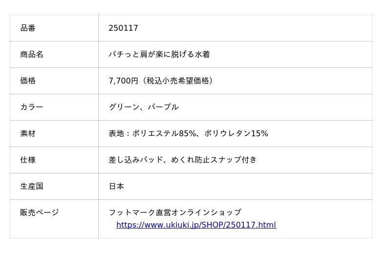 フットマーク株式会社(本社:東京都墨田区、代表取締役社長:磯部 徳史)は、「パチッと肩が楽に脱げる水着」を1月7日(水)より発売いたします。本商品はフィットネス水着のメインユーザーである中高年の方から寄せられた「水着を脱ぐのが難しい」という悩みの声をもとに開発されました。肩に負担をかけずに、スムーズに水着を脱ぐことができる仕様で、肩部のプラスチック製のバックルを軽く押すだけで肩ひもが簡単に外れます。サイズはM~3Lの4サイズ展開、価格は7,700円(税込小売希望価格)です。フットマーク直営ネットショップ、フットマークオンラインショップ楽天店、一部スポーツクラブやスポーツ専門店などで販売いたします。