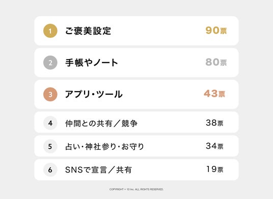 株式会社10(本社:東京都中野区、代表取締役:佐藤 尊紀、以下10 Inc.)は、運営する消費者オンラインコミュニティ「torio cafe」にて、「年末の振り返り・新年の目標設定」に関する調査を実施しました。